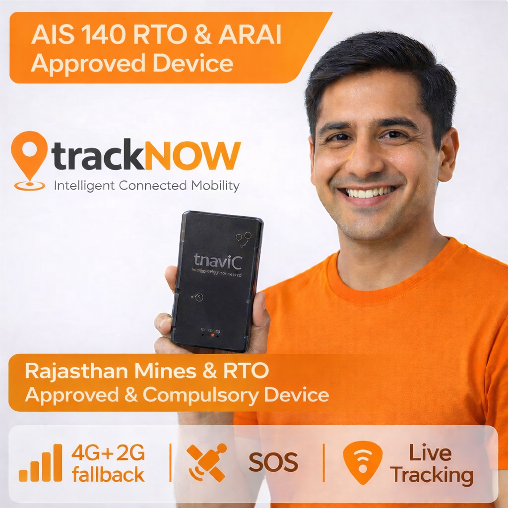 trackNOW tnavIC AIS 140 GPS Device is a Rajasthan RTO-empanelled and ARAI-certified compliance solution engineered for high-demand commercial operations. It is officially integrated with the Rajasthan VLTS (Vehicle Location Tracking System) and the Department of Mines (DMG), ensuring seamless e-Rawanna generation and Fitness Certificate (FC) clearance.